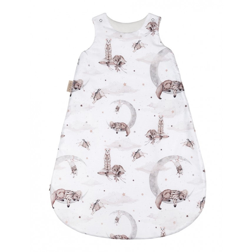 - Der Schlafsack wird an den Schultern mit bequemen Druckknöpfen geschlossen. Dank der zweistufigen Anpassung können Sie den Schlafsack auf die richtige Größe für Ihr Kind einstellen.