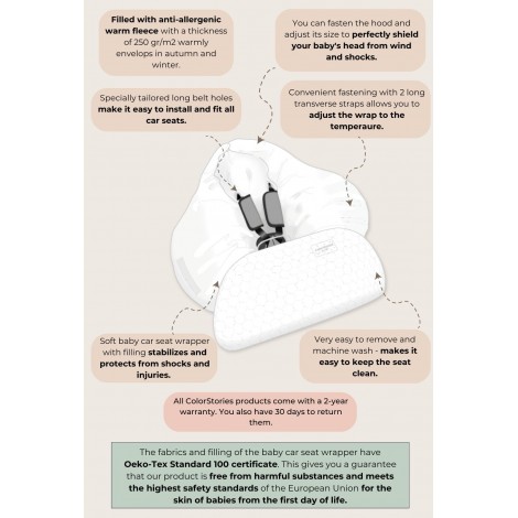 - Kümmert sich um die richtige Temperatur und schützt vor Auskühlung. Dank seiner wärmeisolierenden Eigenschaften schützt die ColorStories Autositzdecke Ihr Kleines vor Temperaturschwankungen während der Fahrt. Beim Einsteigen ins Auto und beim Tragen Ihres Babys sorgt unsere Autositzdecke dafür, dass Ihr Kleines vor Wind und Kälte geschützt ist. Die spezielle Kapuze umhüllt zusätzlich den empfindlichen Kopf.