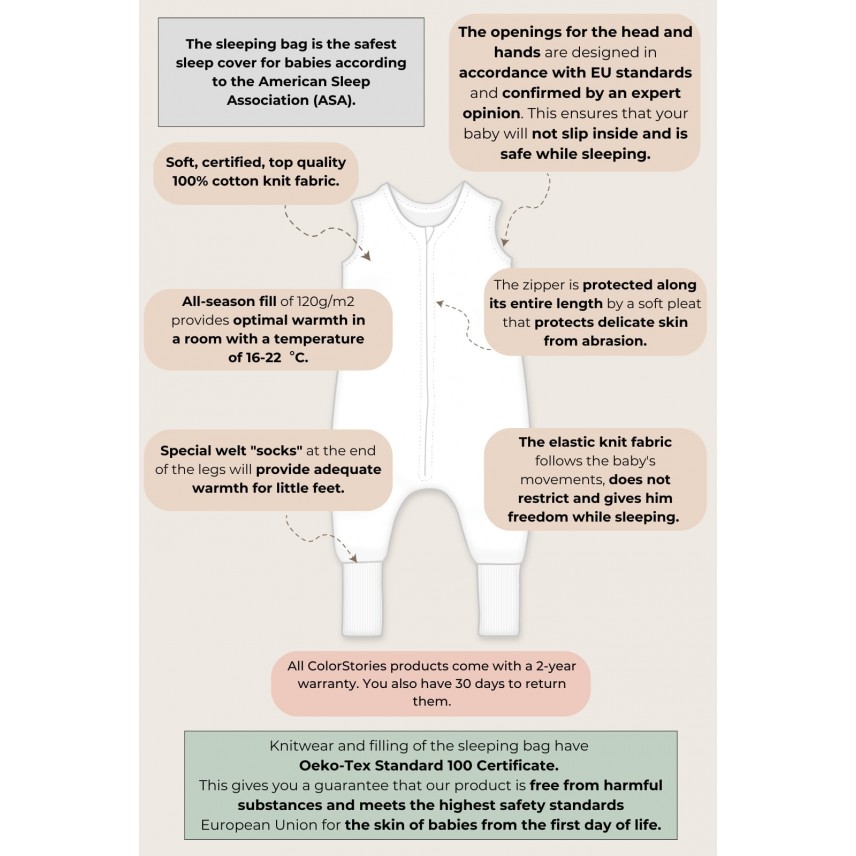The ColorStories sleeping bag with legs is the safest sleep cover for active toddlers! Ensure freedom of movement and proper wrapping for your little one.