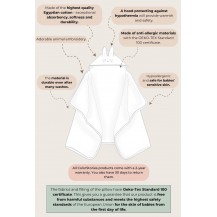 The long fibers of Egyptian cotton absorb moisture exceptionally quickly and well. A baby hooded towel should not only be soft, but also super absorbent. Bubbles do not like to be wiped, and their skin is very sensitive to irritation and chafing. Our hooded towel meets these requirements one hundred percent. Made of highly absorbent Egyptian cotton, it absorbs water perfectly and quickly.