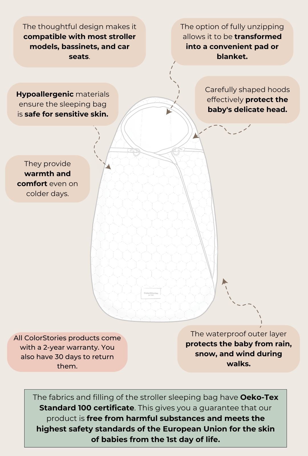 ColorStoriesThis stroller footmuff is an extremely practical product that can be used in pram, stroller and car seat.