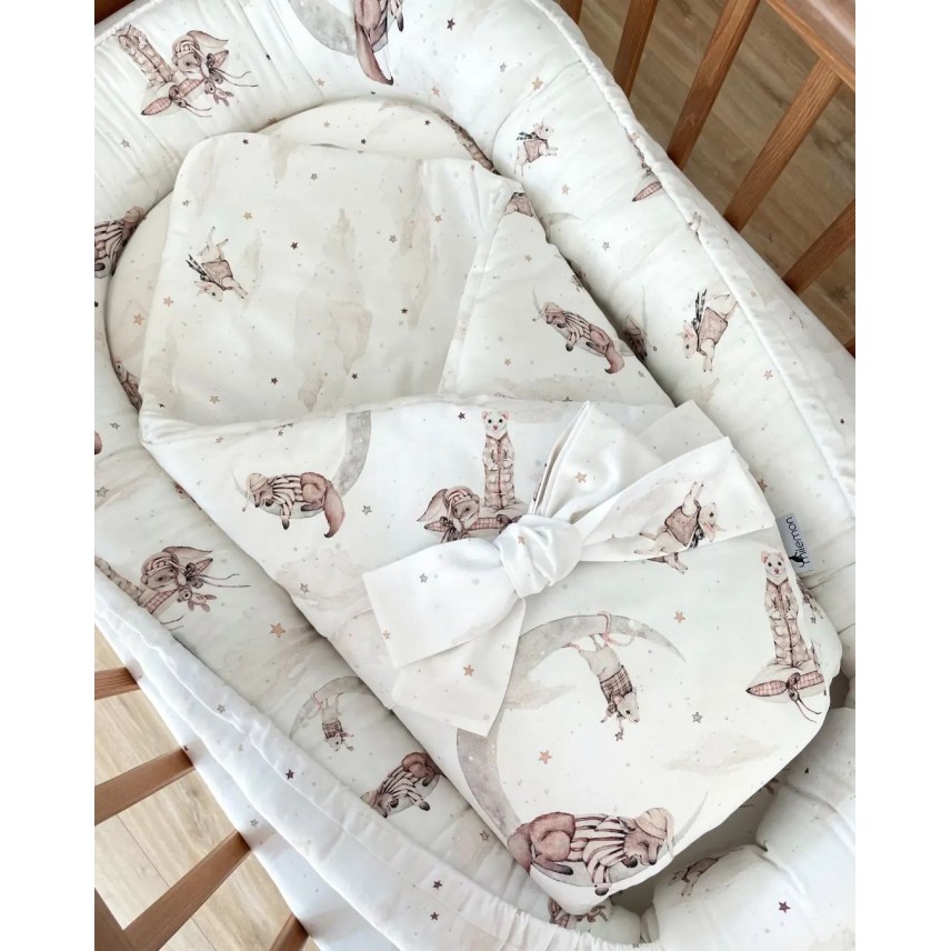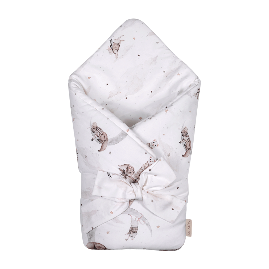 Le nid d'ange n'a pas d'attaches supplémentaires ni de velcro. Il est conçu pour qu'après avoir dénoué l'arc et déplié, il puisse être utilisé comme tapis de jeu pour un bébé ou comme couette indépendante pour une poussette ou un couffin. Grâce à cette solution, l'emmaillotage peut toujours être utilisé même si votre bébé ne grandit plus.