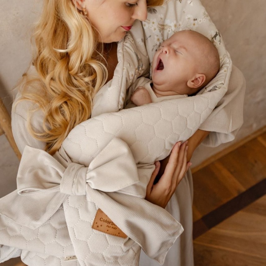 Lors de la préparation du trousseau de naissance, la composition et la sécurité des matériaux sont des critères essentiels. Nos nids d’ange sont confectionnés en coton 100 % de la plus haute qualité : doux, agréable au toucher, respirant, régulant l’humidité et évitant toute surchauffe. À l’extérieur, ils sont doublés d’un velours moelleux et rembourrés d’une ouate hypoallergénique en silicone, souple et chaude, d’un grammage de 220 g/m².